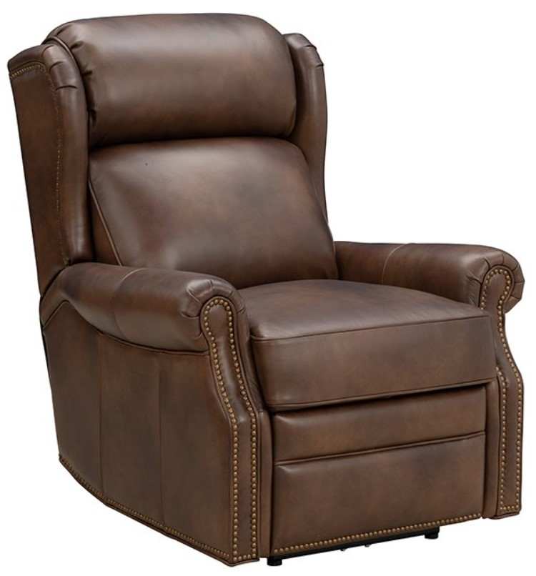 Three power lounger recliner with power recline, power headrest and power lumbar. Kneed back rolled arms, 44” high winged pub back, boxed seat cushion with pocketed coil springs and down blend feather blend topper. Nail head trim accents on arms, wings, base rail, and ottoman.Read More