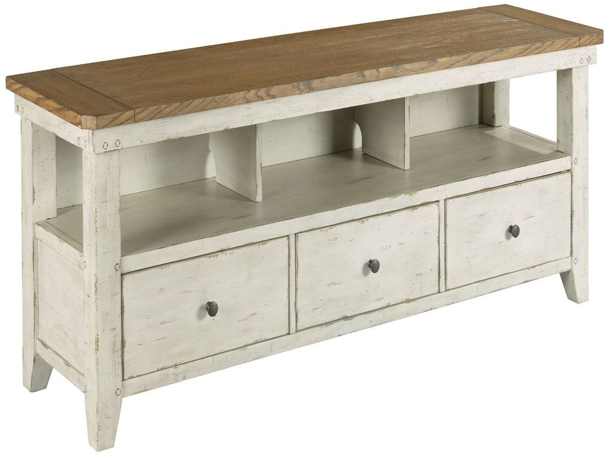 Crafted of White Oak Veneers in a chalk white finish and medium brown finish with warm undertones. The distressed farmhouse style has exposed joinery, two rustic finishes, and functionality. Features primitive design elements including generous proportions, and square peg in round hole exposed joinery.Read More