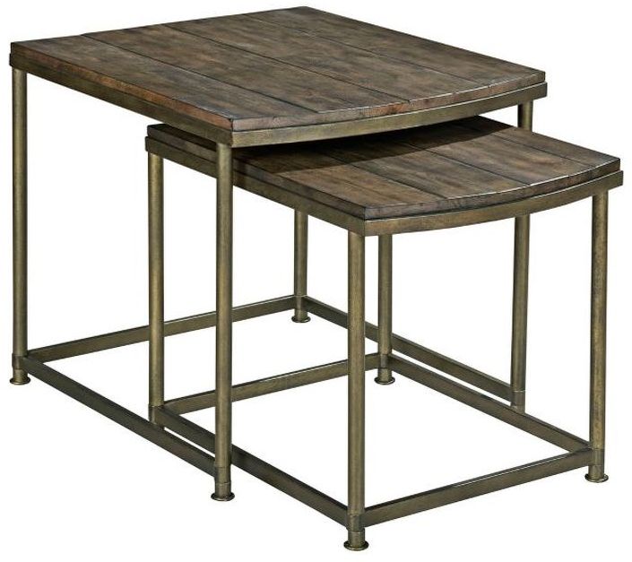 This Hammary® Leone 2-Piece Weathered Barn Nesting End Table with Antique Brass Base Set crafted of square and round metal tubing and tongue and grooved solid plank tops. Metal is antique brass and tops are weathered barn finish with worm holes and distressing.Read More