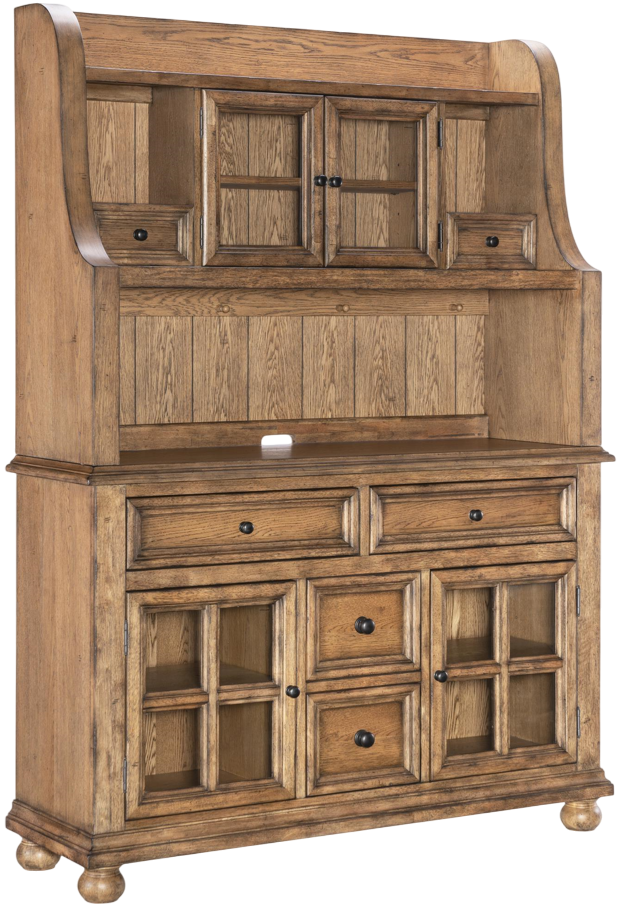 The Legacy Classic Vintage Market server with hutch is a commanding yet elegant dining room piece. Crafted from select hardwoods and oak veneer, it’s finished in a warm barnwood oak tone. The upper hutch features two glass-front doors, an adjustable shelf, two small drawers, and four hanging pegs.Read More