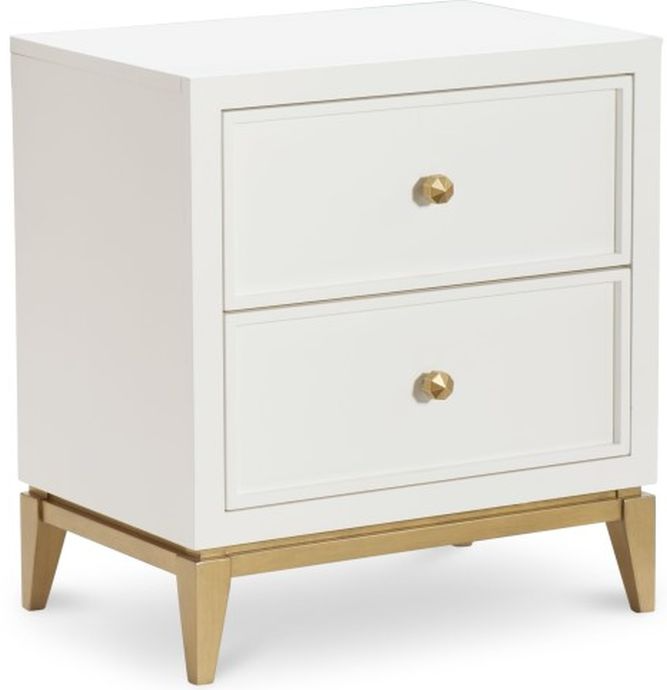The clean, transitional lines of the white finish are offset with gold accents and Soft Gold Finish Knob hardware, making each piece as warm and inviting as it is stylish.