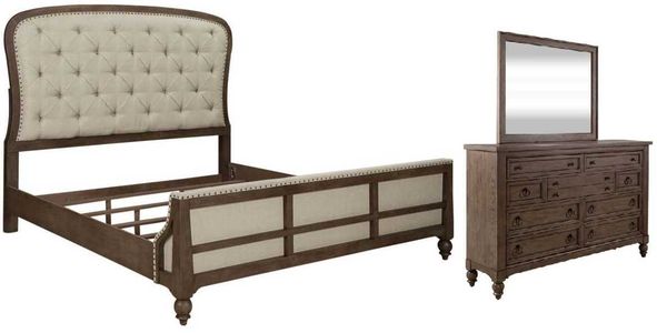 When details matter, choose the Americana Farmhouse queen shelter bed, dresser, and mirror. Crafted of poplar solids with white oak veneers, this kit features a wire-brushed dusty taupe finish with wormhole distressing, full extension drawers with wood framed drawer fronts, premium felt-lined top, and cedar lined bottom drawers, and turned bun feet.Read More