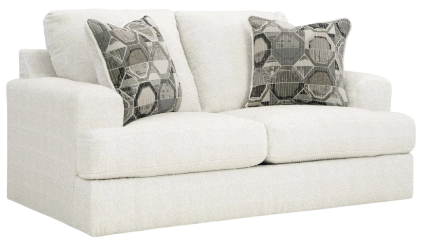 Craving casual refinement? This loveseat has you covered. Its decidedly contemporary frame cradles sizable cushions in an ultra-soft neutral hue, lightening the mood in your living room with simple style and everyday comfort. Solid and geometric accent pillows perfect the chic-meets-cozy vibe.Read More