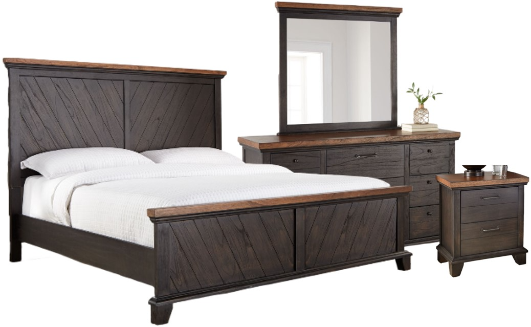 A rustic, farmhouse-inspired bedroom, Bear Creek features a chocolate finish that contrasts beautifully with honey-smoke stained tops and cap rails. The chevron patterned headboard and footboard is offered in King and Queen sizes and the bedroom collection offers a variety of storage items with ultra-deep drawers supported by side drawer glides for easy operation.Read More