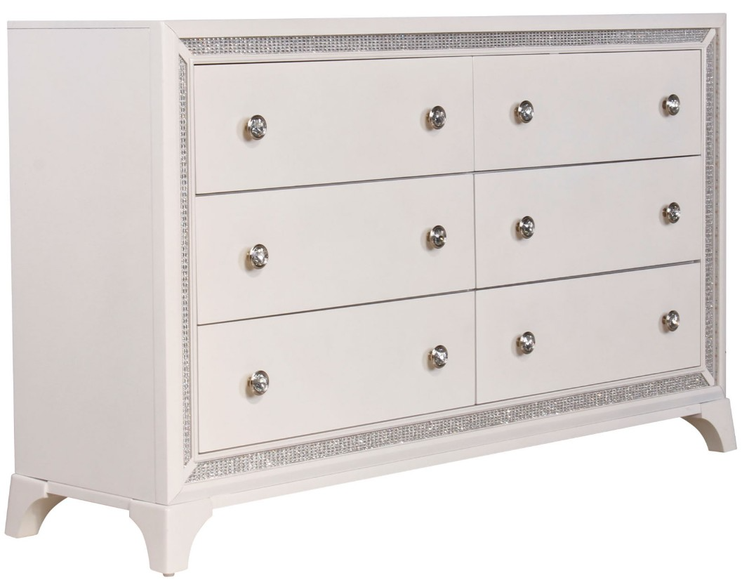 Infuse your bedroom with bold glamour and practical elegance through the Cassie Illuminating Glam Dresser. Its shimmering pearl finish, paired with crystal-inlaid nickel hardware, creates a dazzling focal point. The crystal-accented border lights up with the flip of a switch, bringing a soft glow to your space and adding a touch of luxury.Read More