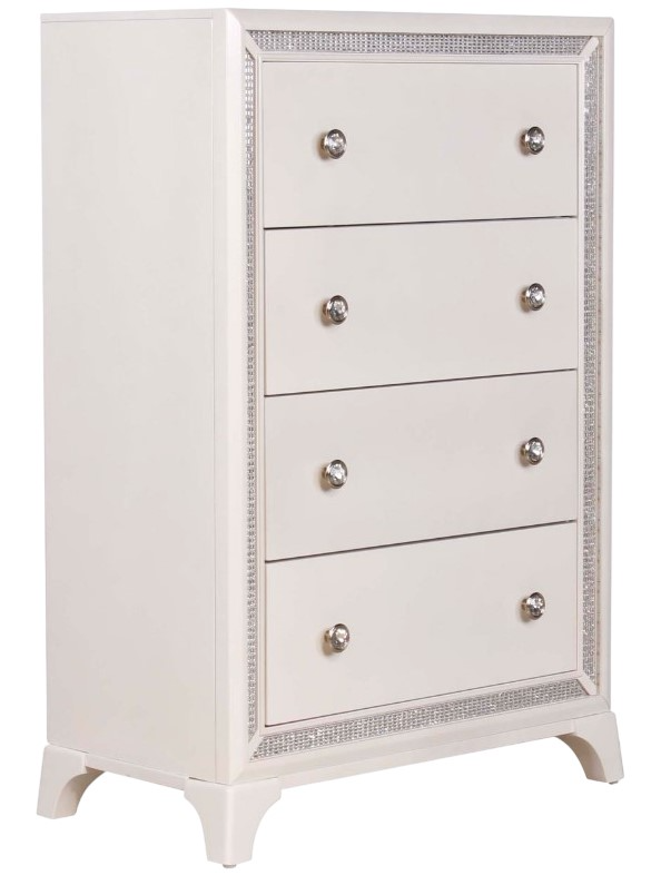 The Cassie 5-Drawer Chest brings ultra-glam style with its shimmering pearl finish and crystal in-laid hardware. Offering ample storage space, its elegant design is complemented by a crystal-inlaid border that illuminates at the flip of a switch, adding a touch of enchantment to any room.Read More