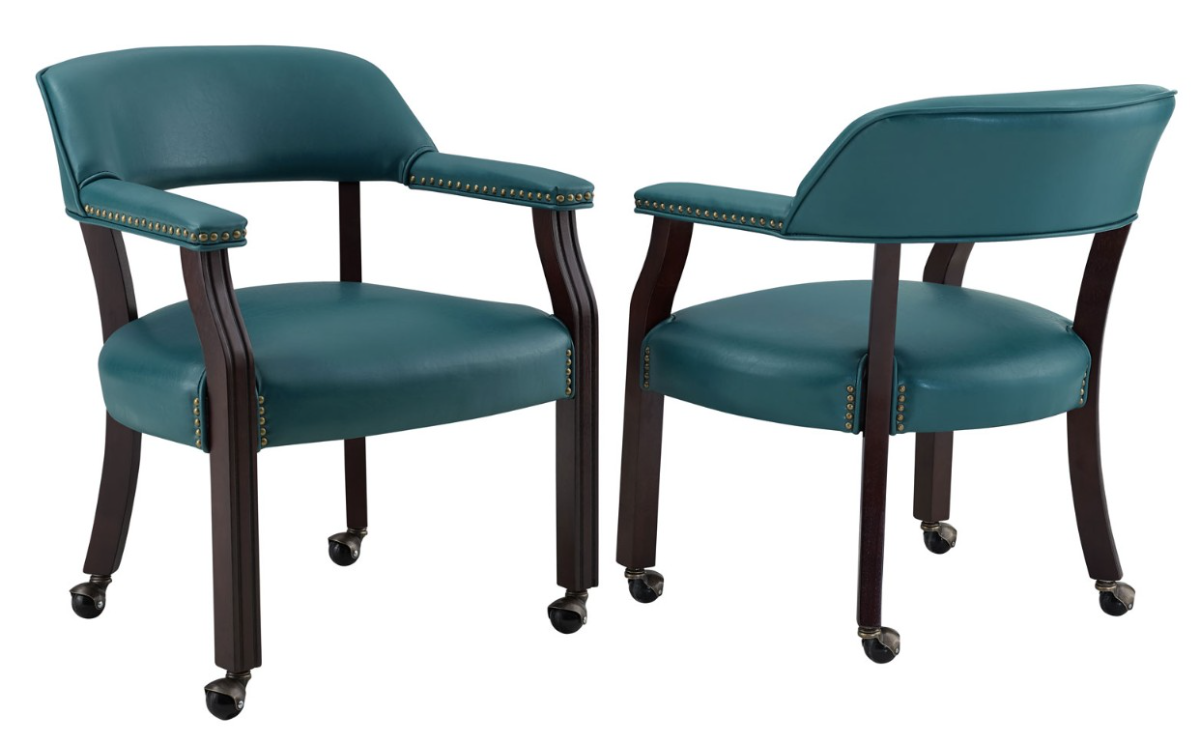 Captain chairs have arms, casters, nailhead trim and are available in brown, black, grey, navy or teal vinyl