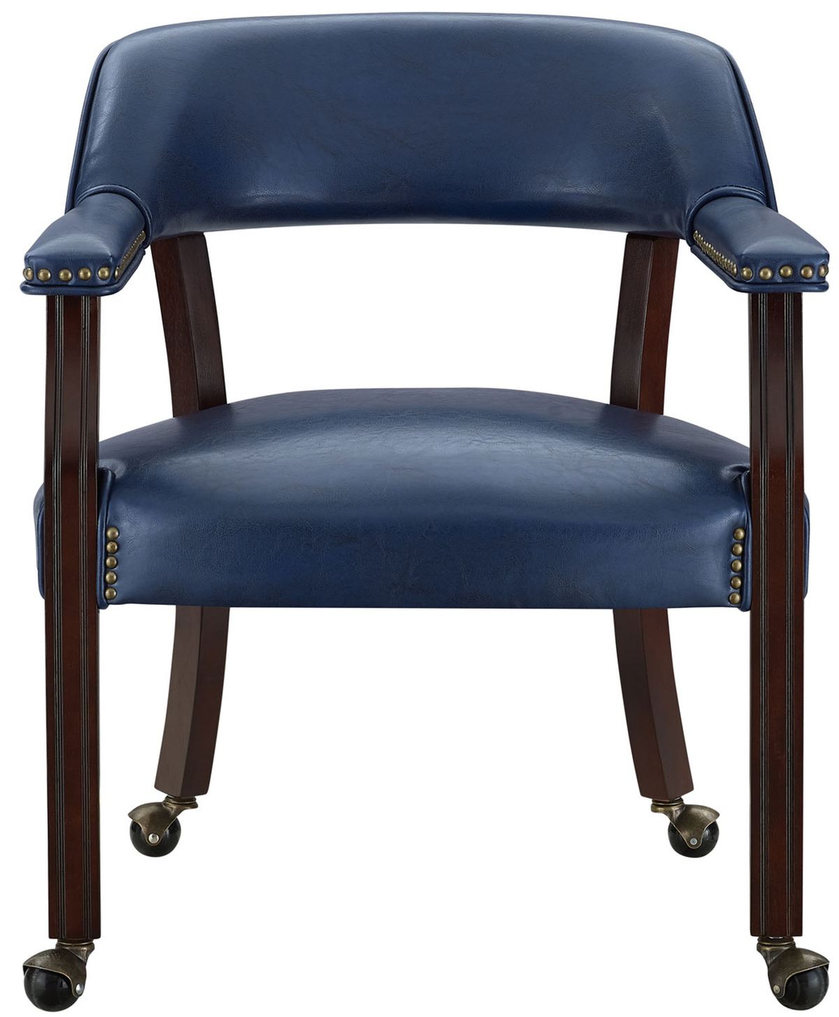 Enjoy both game night and dining night with this dual-purpose dining and game chair. This upholstered captain’s chair is castered for easy mobility and is shown in black with other colors available. The chair features nailhead trim and rich cherry colored finish to work well on game night or for dining.Read More